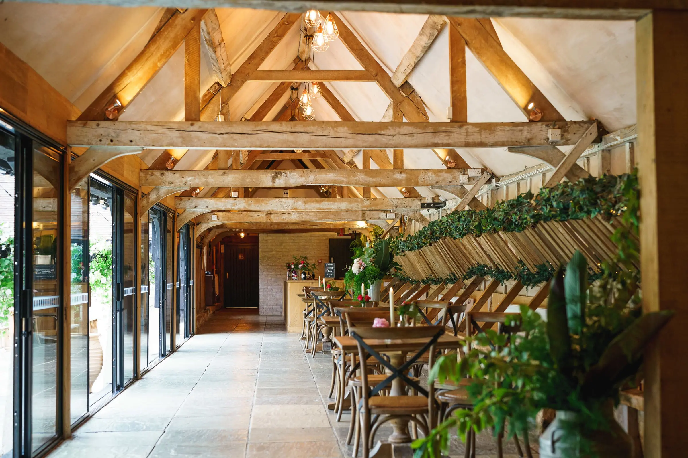 This enchanting space is framed by a beautiful, vaulted ceiling, timber beams and a unique wooden block floor, with large barn doors opening out onto the manicured green and adjoining terrace.